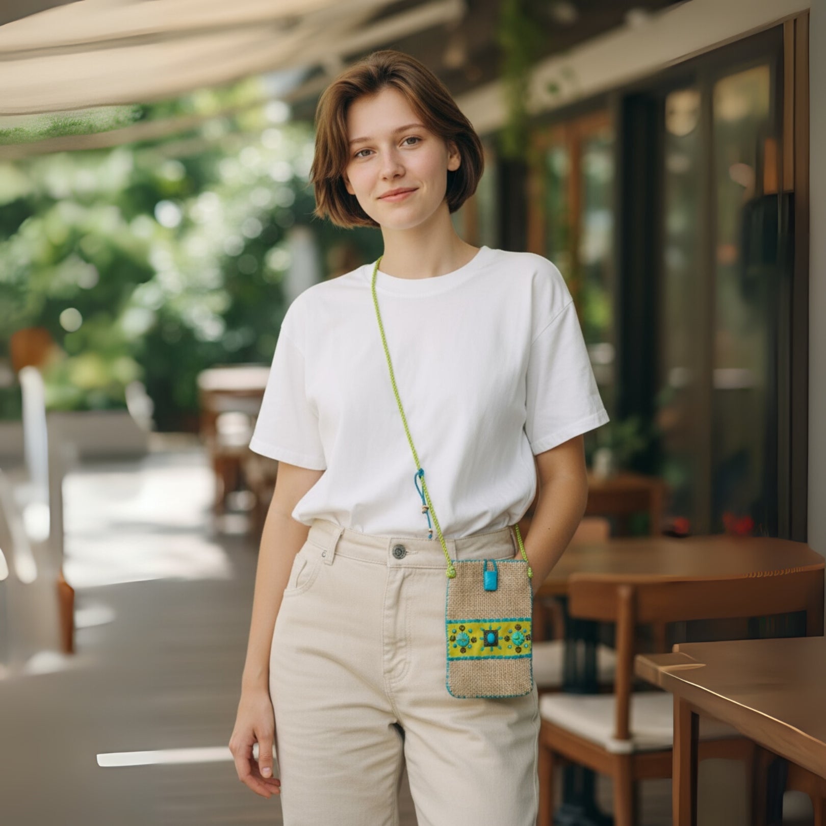 Carry your essentials in style with this handmade boho jute phone bag. Crafted from natural burlap and decorated with turquoise stones, blue stitching, and green embroidery, it’s the perfect mix of earthy and chic. The crossbody strap offers comfort for festivals, markets, or everyday adventures. Each piece is artisan-made and eco-friendly — ideal for free spirits who love sustainable fashion.