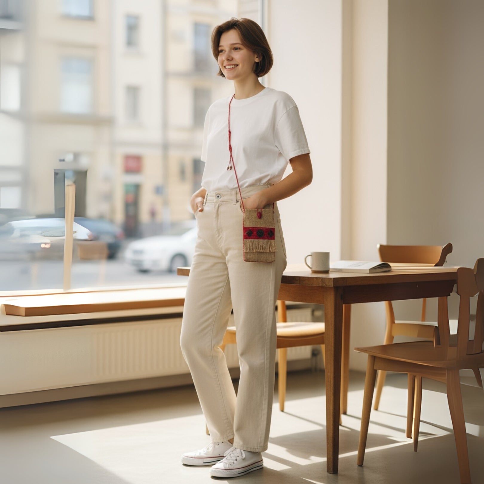 This handmade phone bag is a beautiful fusion of rustic simplicity and artisanal elegance, designed to combine function with folk-inspired artistry. It radiates a bohemian charm while maintaining a natural, earthy vibe due to the use of burlap (jute) as the primary material. The contrast between the rough burlap texture and the vibrant red embellishments makes the piece visually captivating and culturally expressive.
